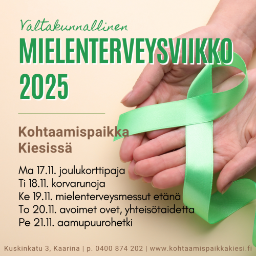 Kohtaamispaikka Kiesi osallistuu teemaviikkoon tarjoamalla maanantaista perjantaihin ohjelmaa, joka edistää toipumista ja mielen hyvinvointia.